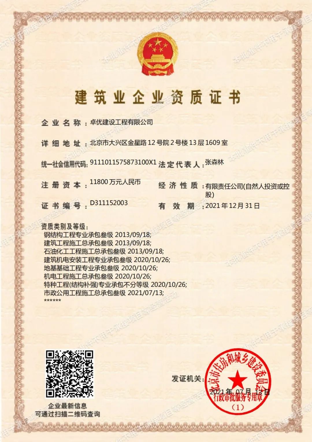 建筑工程施工总承包叁级、钢结构工程专业承包叁级、石油化工工程施工总承包叁级、建筑机电安装工程专业承包叁级、建筑装修装饰工程专业承包贰级、地基基础工程专业承包叁级、机电工程施工总承包叁级、消防设施工程专业承包贰级、防水防腐保温工程专业承包贰级、市政公用工程施工总承包叁级、特种工程(结构补强)专业承包不分等级、模板脚手架不分等级、劳动派遣、施工劳务不分登记、招标代理、造价咨询乙级等。